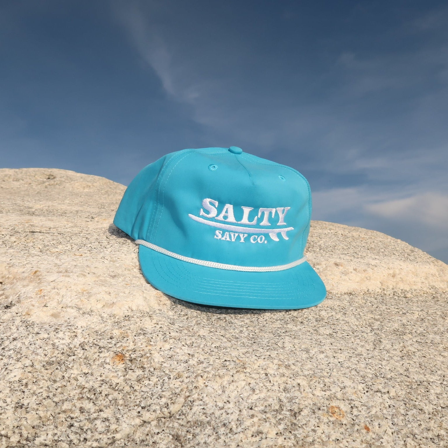 The Salty rope hat keeps things cool and coastal with a bold blue nylon build, crisp white embroidery, and classic rope detail across the brim. Lightweight, water-resistant, and made for living salty—whatever that means to you.